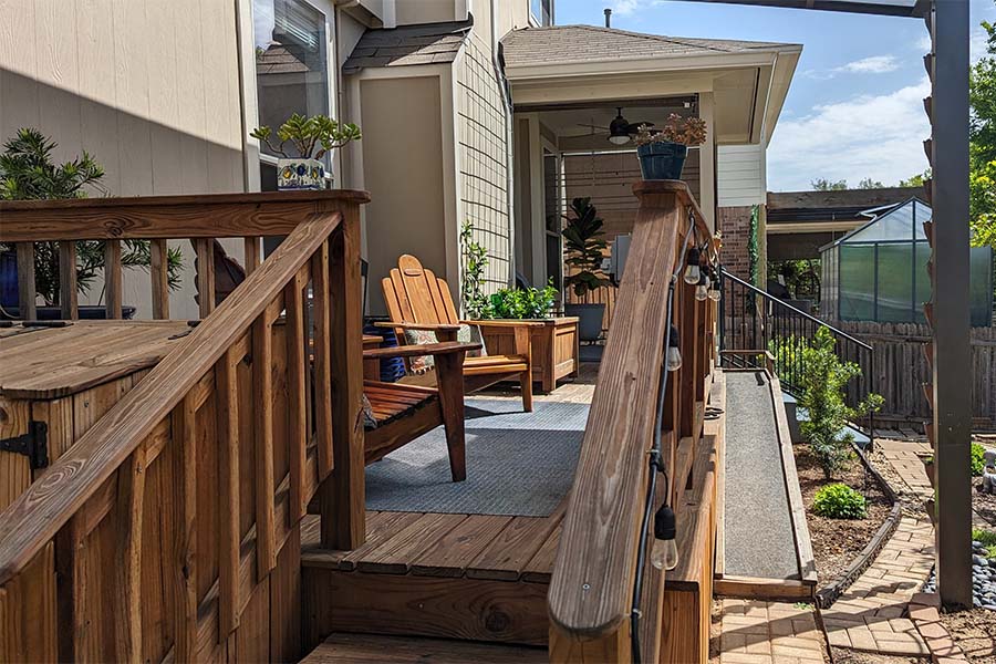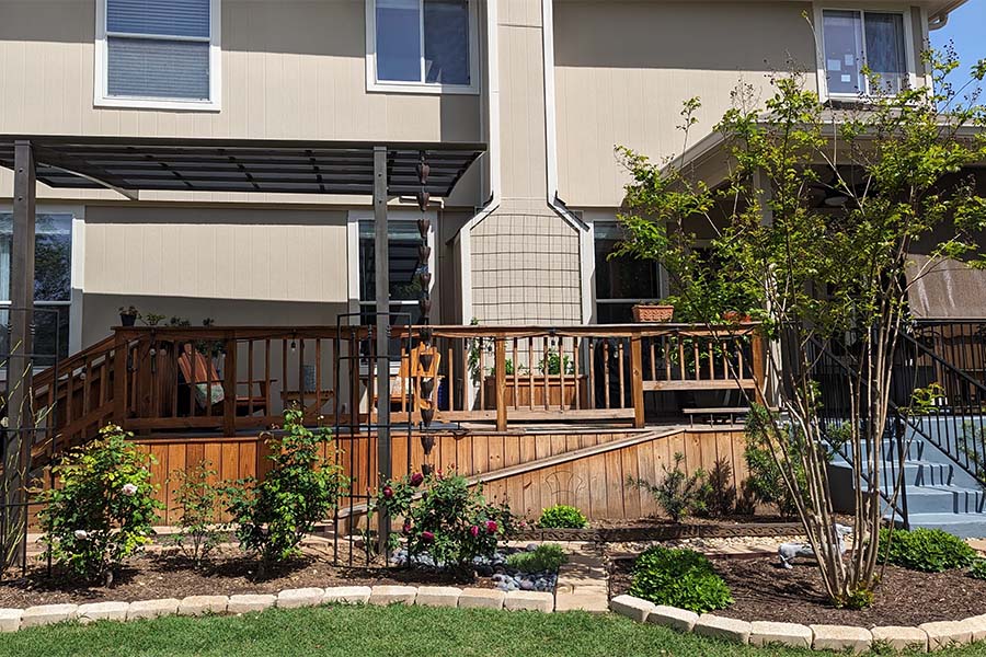 Early on, severe slopes in the backyard demanded adequate drainage which meant some tough digging in the limestone soil all along the length of the yard. Flower beds came next. Bricks and stones defined those spaces, added garden soil and mulch allowed roots to grow. More recently, an elevated wooden deck was added to the back porch which included a narrow little ramp so her short-legged miniature dachshund wouldn’t need to use the stairs. The view from deck towards the back of the property includes a garden shed and a pleasant seating area.